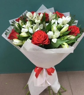 Ощутите истинное великолепие этого букета из одноголовых роз и альстромерий. Красота этих цветов не нуждается в словах, их нежные лепестки и чистые оттенки заставят ваше сердце замирать от восхищения. Зелень, тщательно подобранная специалистами, дополняет этот букет, создавая прекрасное обрамление для каждого цветка. Упаковка из крафт-бумаги добавляет шарму и природность этому изысканному подарку.